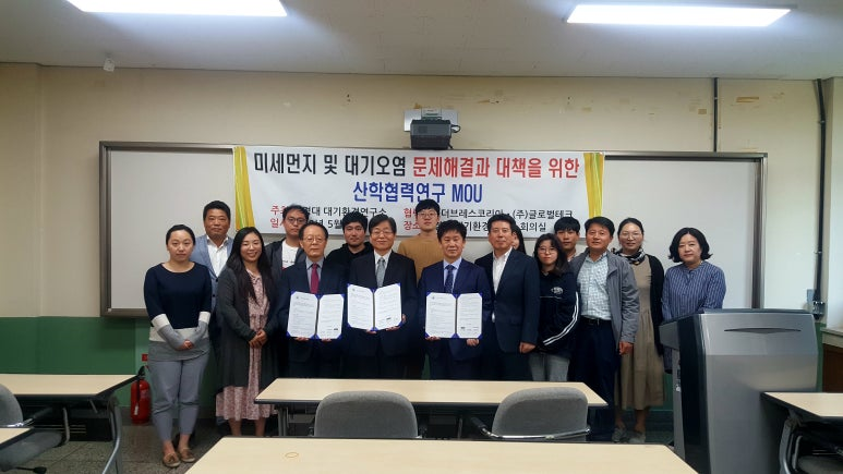 최근 현안이 되는 미세먼지 및 대기오염 문제 해결을 위해 부경대 대기환경연구소(소장 이동인 교수), (주)더브레스코리아(대표 장동주), (주)글로벌테크(대표 윤광운)가 청정공기 관련 산학협력 공동연구와 기술개발, 인력양성 등에 관한 상호 연구협력 MOU를 체결했다.