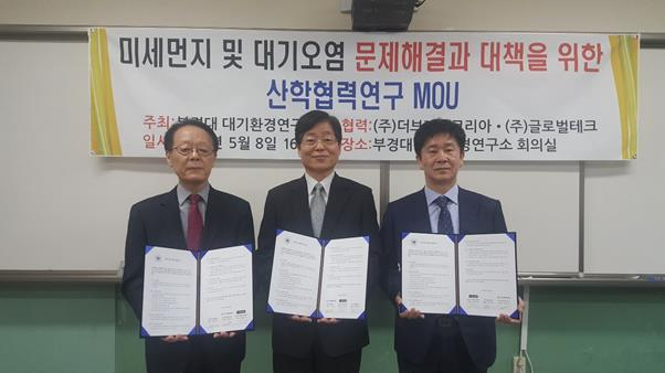 최근 현안이 되는 미세먼지 및 대기오염 문제 해결을 위해 부경대 대기환경연구소(소장 이동인 교수), (주)더브레스코리아(대표 장동주), (주)글로벌테크(대표 윤광운)가 청정공기 관련 산학협력 공동연구와 기술개발, 인력양성 등에 관한 상호 연구협력 MOU를 체결했다.